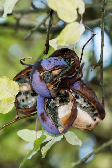 Bladene er stort set falde af æbletræet, og der er nu kun Akebia blade tilbage i trætoppen. De har den flotteste gul-lilla farve og i det lave og kølige efterårslys får de et magisk skær. Frugterne hænger neden for bladene, og måske derfor kunne vi nu få øje på dem deroppe.